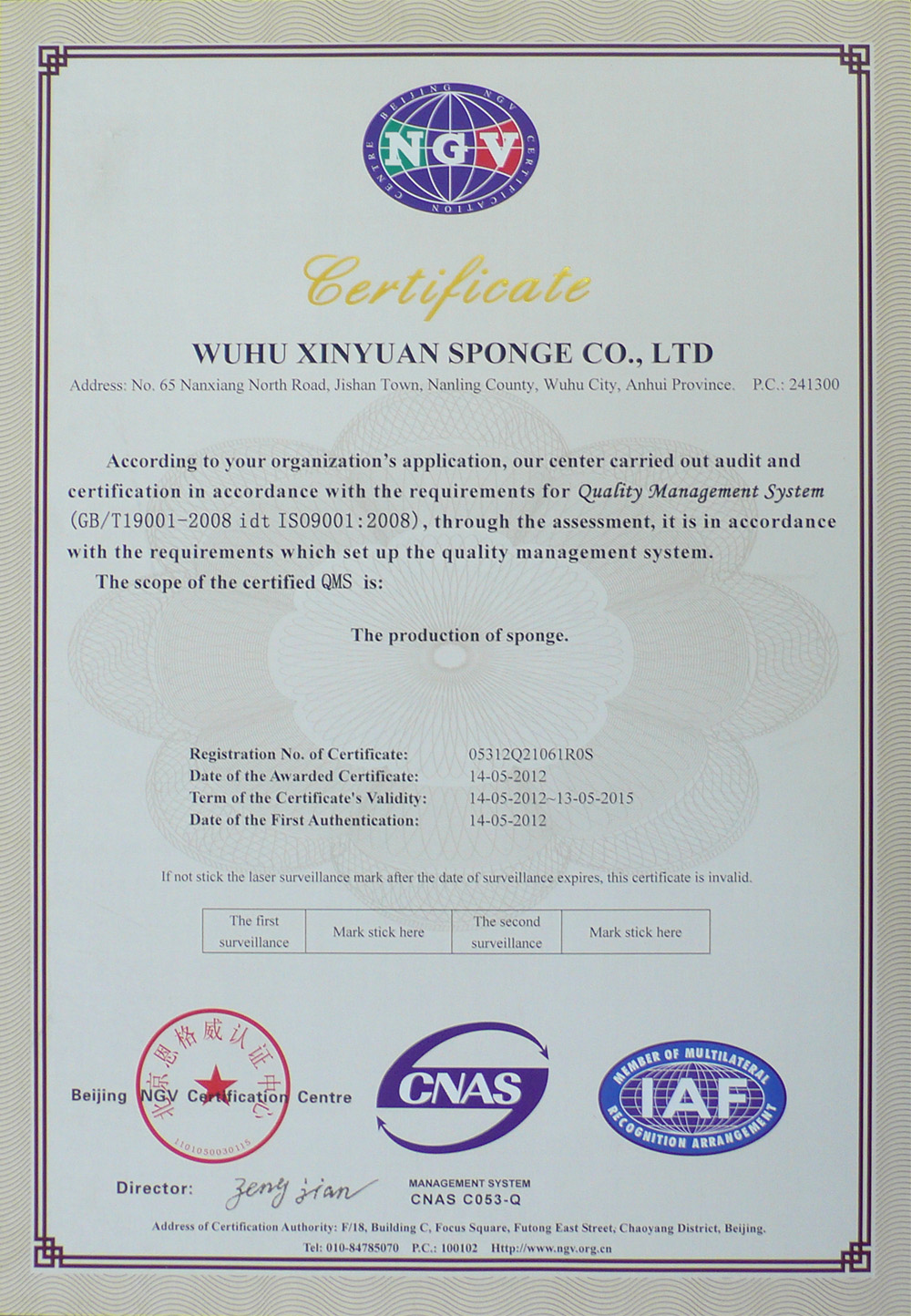 2012年5月14日,我司顺利通过了ISO9001:2008质量管理体系认证。启动认证工作以来,公司领导高度重视,各部门积极参与,多次集中学习ISO9001质量管理体系文件要求,熟悉文件的精髓和内涵,尔后结合公司自身的运作流程和规章制度编制了我司的质量文件和程序文件。经过公司群策群力、全员参与,顺利通过了考核。这对馨源海绵来说,具有重要的意义,对我司走上科学化、规范化、制度化管理的轨道和进一步提高产品质量、服务质量起到了巨大的推动作用。